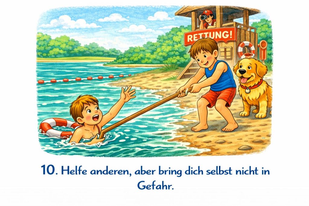 - Kenntnisse von Verhalten zur Selbstrettung (z.B. Verhalten bei Erschöpfung, Lösen von Krämpfen)